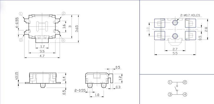 Side pushing SMT Tact type|3.9*3.6*H(1.5mm)|Various terminal types|Inner dust cover used