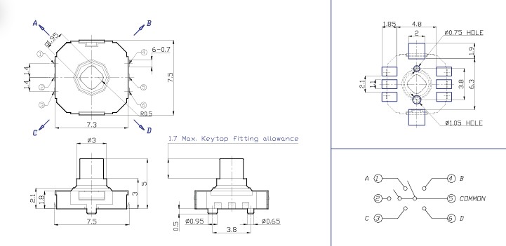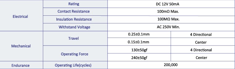 FEATURESCenter push + 4 directional Tact|6.5*7.1*H(5.0mm)ApplicationsAll kinds of electronic equipments such as car audio and home appliances | Digital Camera,Camcorders,Mobile Phones